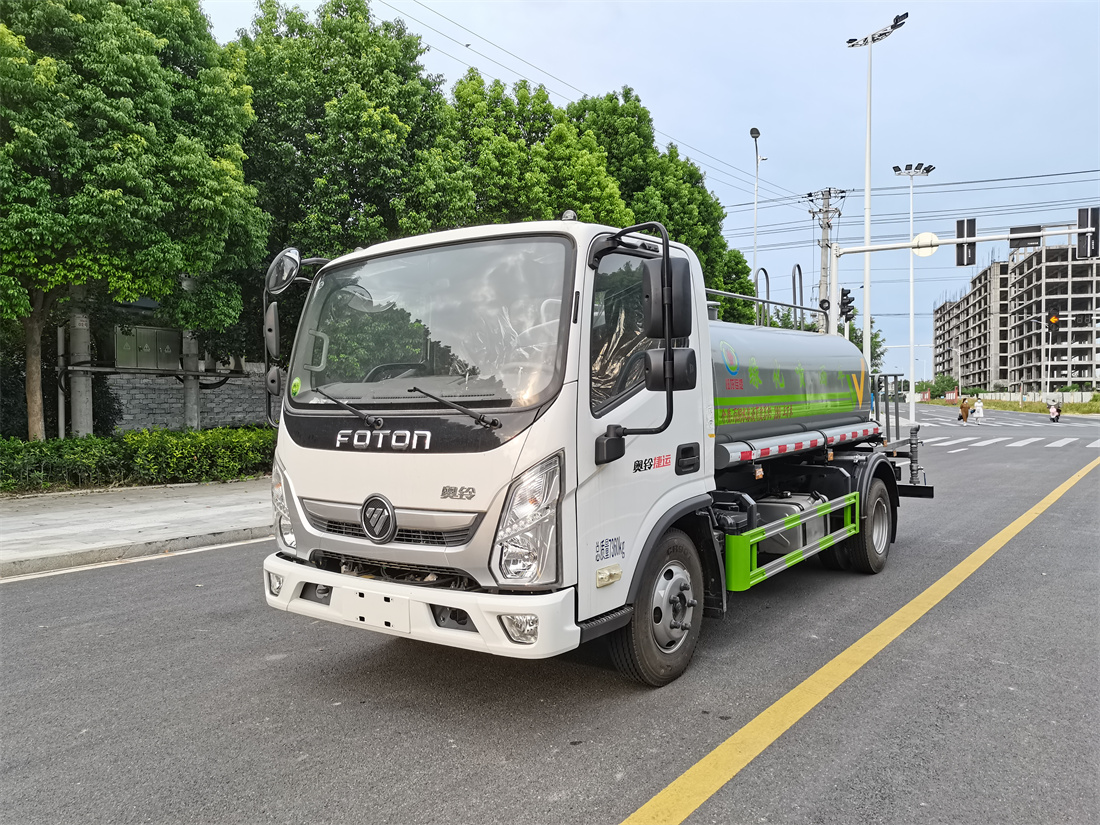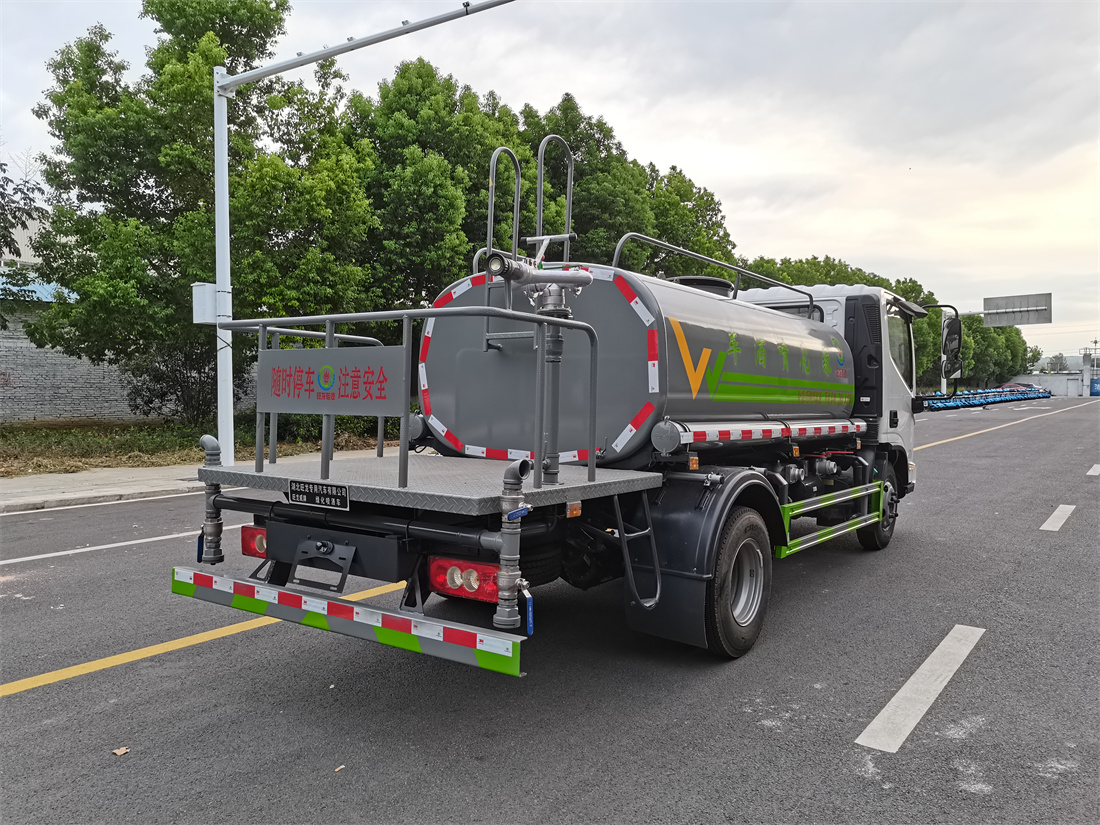 灑水車前裝有鴨形噴嘴或圓頭沖嘴,后面裝有圓柱開灑水噴嘴或蓮蓬頭噴嘴,后部有一工作平臺(tái),裝配有水炮。后部還可裝8個(gè)噴嘴(選裝)。