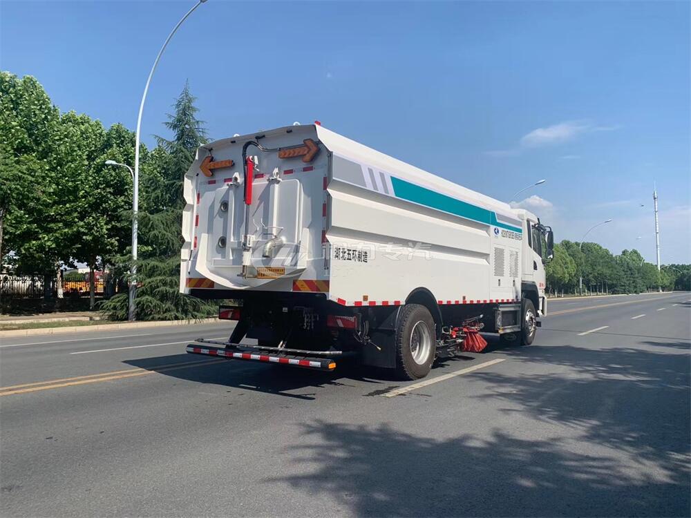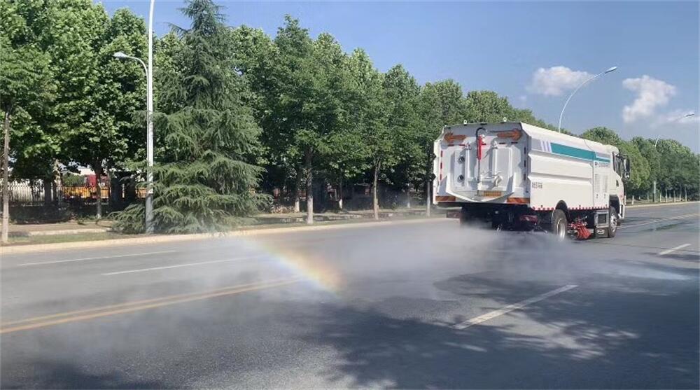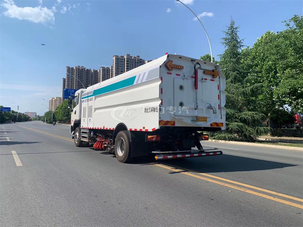 1)該車集掃路車和高壓清洗車功能于一體,具備路面清掃、路面洗刷、高壓清洗、路緣石洗刷、垃圾收集、污水回收、噴霧降塵和道路隔離墻清洗、小廣告清洗等多種作業功能。