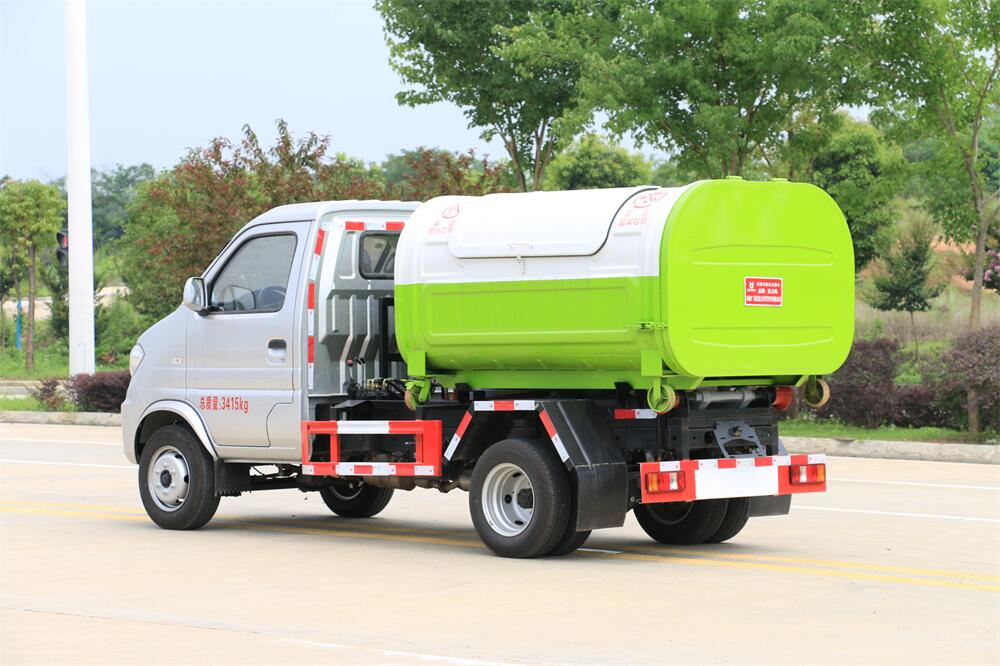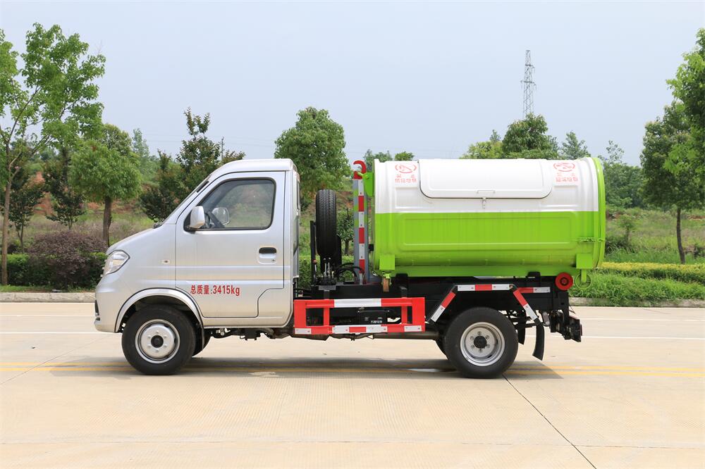 該款鉤臂式垃圾車由液壓系統(tǒng)、操作系統(tǒng)組成。舉升油制缸(1支)系國(guó)內(nèi)知名液壓件廠家生產(chǎn)的雙作用油缸。垃圾廂可自吊上放下,可自行傾倒垃圾,上下一次工作循環(huán)時(shí)間≤50S。該車的特點(diǎn)是一個(gè)車能配多個(gè)垃圾廂,能實(shí)現(xiàn)一臺(tái)車與多個(gè)垃圾廂聯(lián)合作業(yè),循環(huán)運(yùn)輸,充分提高了車輛的運(yùn)輸能力。