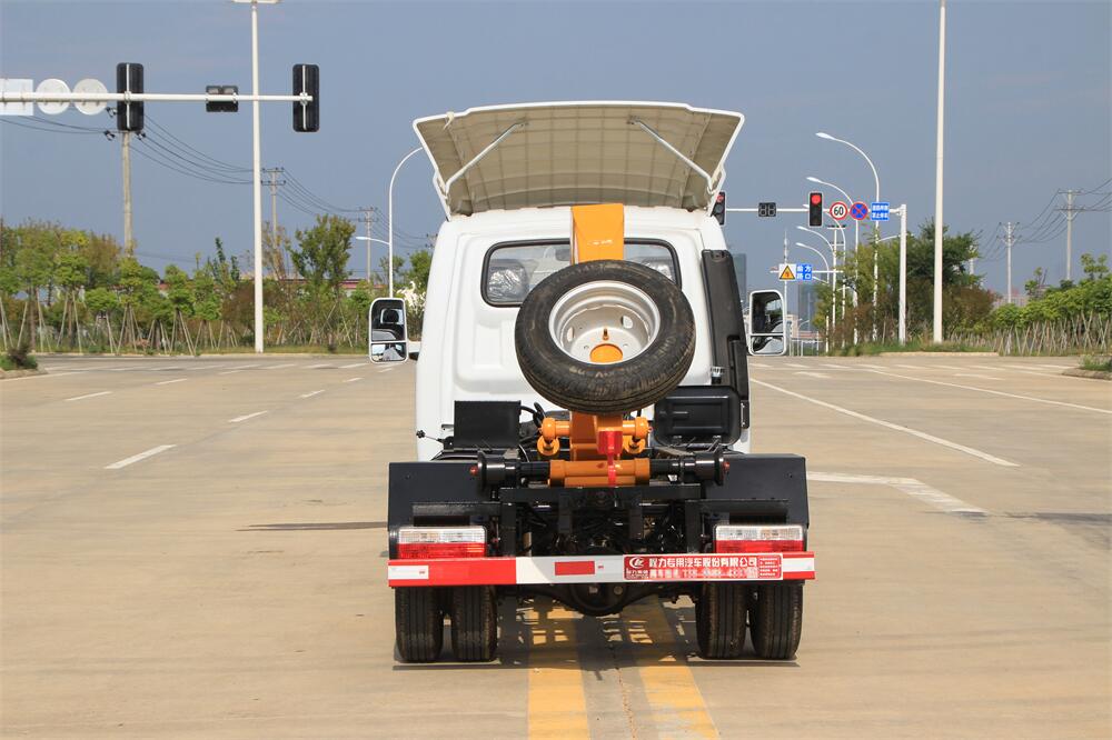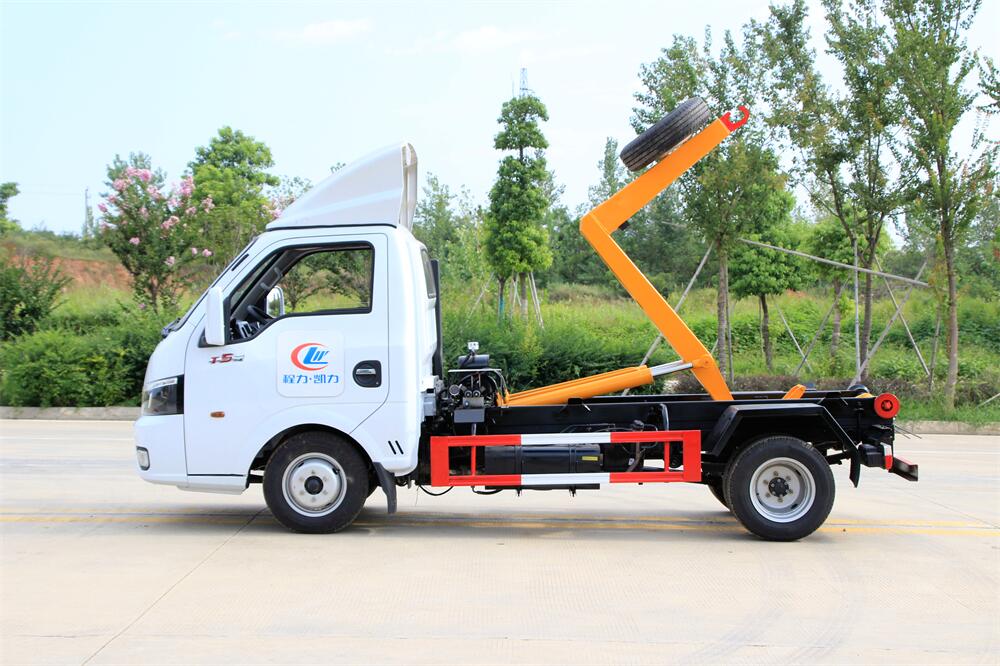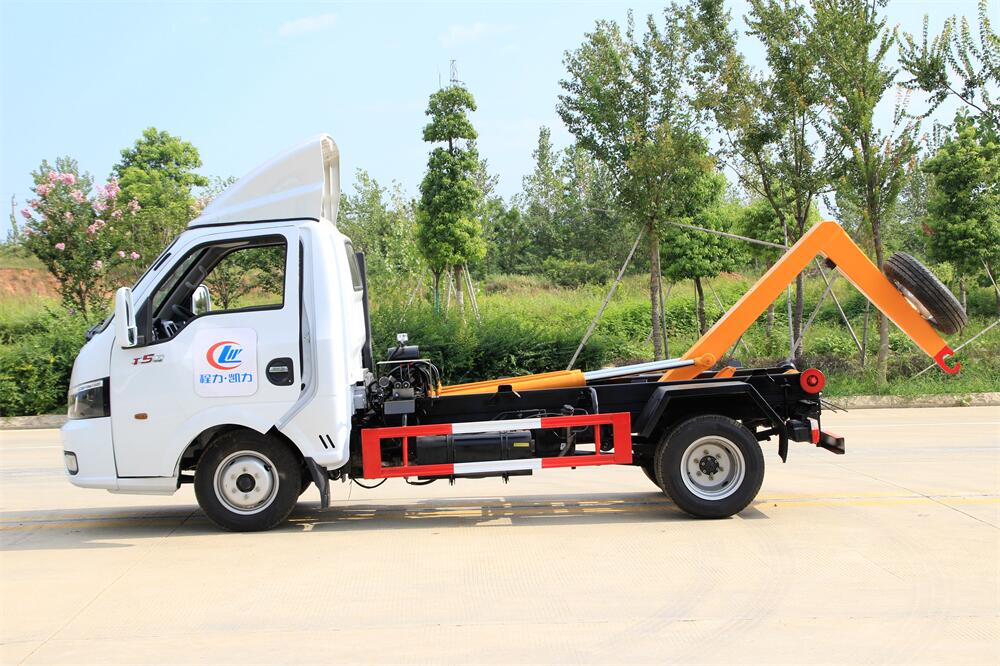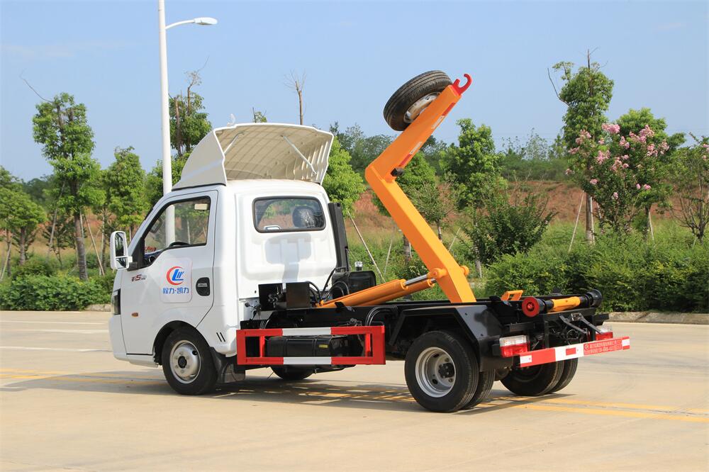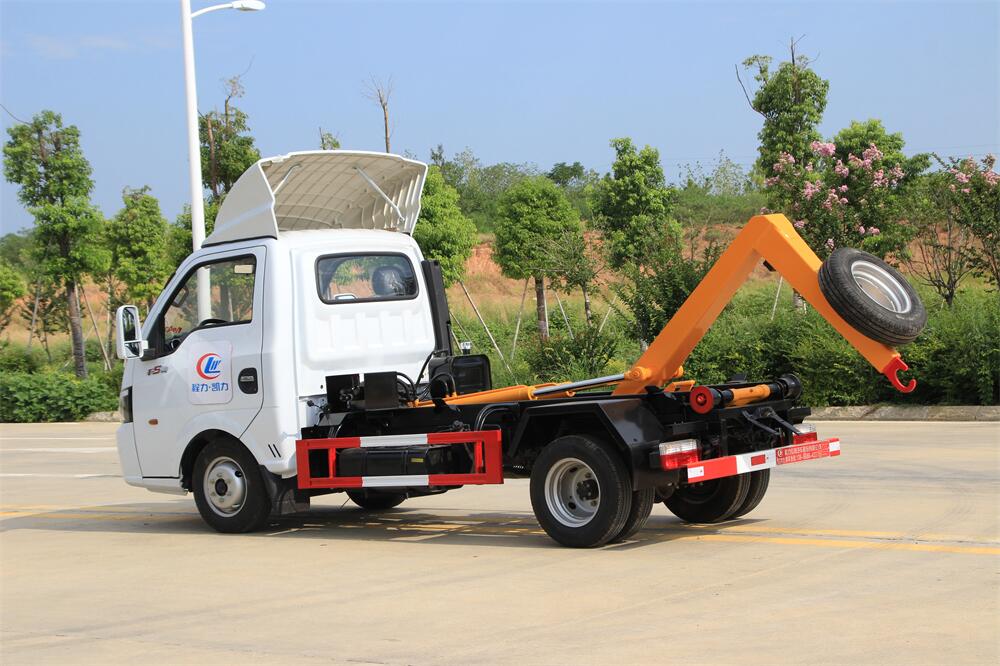該款鉤臂式垃圾車由液壓系統(tǒng)、操作系統(tǒng)組成。舉升油制缸(1支)系國內(nèi)知名液壓件廠家生產(chǎn)的雙作用油缸。垃圾廂可自吊上放下,可自行傾倒垃圾,上下一次工作循環(huán)時間≤50S。該車的特點是一個車能配多個垃圾廂,能實現(xiàn)一臺車與多個垃圾廂聯(lián)合作業(yè),循環(huán)運輸,充分提高了車輛的運輸能力。