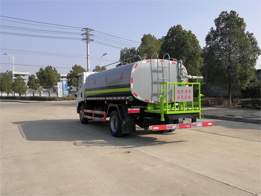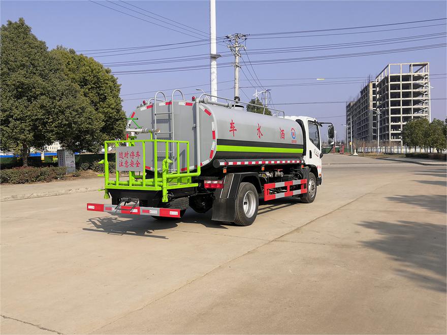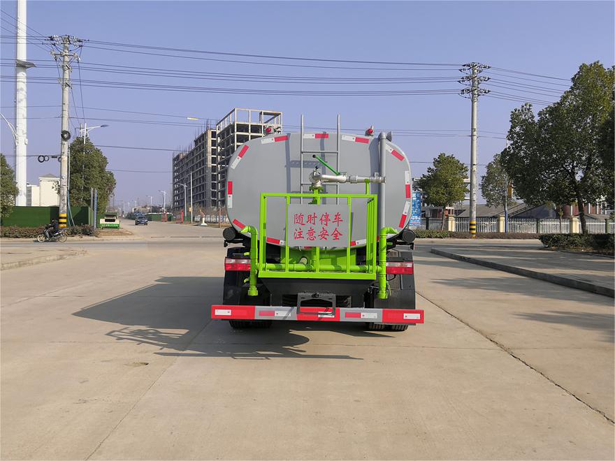 灑水車前裝有鴨形噴嘴或圓頭沖嘴,后面裝有圓柱開灑水噴嘴或蓮蓬頭噴嘴,后部有一工作平臺(tái),裝配有水炮。后部還可裝8個(gè)噴嘴(選裝)。