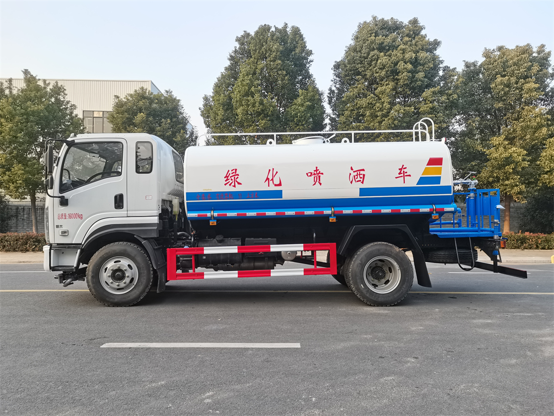 灑水車前裝有鴨形噴嘴或圓頭沖嘴,后面裝有圓柱開灑水噴嘴或蓮蓬頭噴嘴,后部有一工作平臺,裝配有水炮。后部還可裝8個噴嘴(選裝)。