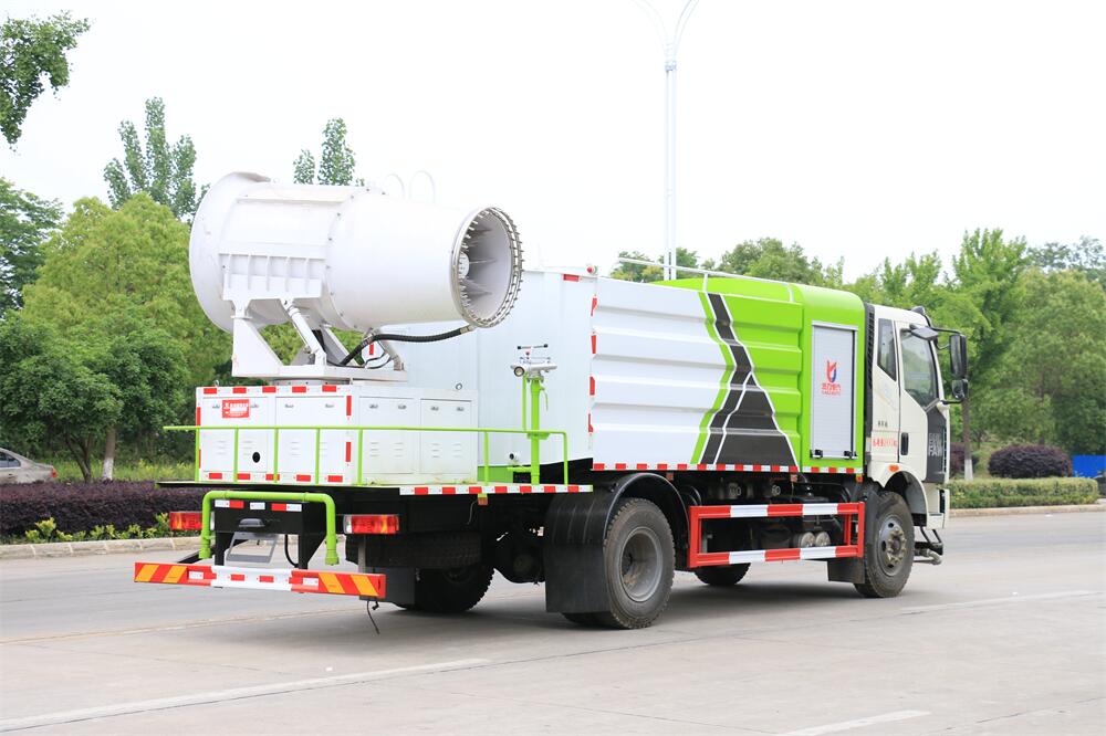 上裝配置:罐體容積為 12立方,選配風(fēng)送式霧炮機(jī)組射程30米、40米、50米、60米、80米、100米、120米霧炮,罐體鋼板為4mm碳鋼Q235材質(zhì),罐內(nèi)隔板具有防波作用,以減輕汽車(chē)行駛時(shí)罐體液體沖擊,罐體及整車(chē)外形尺寸按照公告。帶大功率專(zhuān)用灑水泵,泵可自吸自排,整車(chē)前沖、后灑、側(cè)噴、帶65消防接口,后平臺(tái)配CLW-50、CLW-60、CLW-80、CLW-100、CLW-120型風(fēng)送式霧炮機(jī)組;罐體前封頭配大功率柴油發(fā)電機(jī)組;前封頭帶水位計(jì),后平臺(tái)主管路帶1寸澆花接口,后爬梯。帶兩根輸水管及陰陽(yáng)端。罐體顏色:銀/灰/綠,罐體兩側(cè)噴“多功能抑塵車(chē)”字樣,貼反光標(biāo)示。