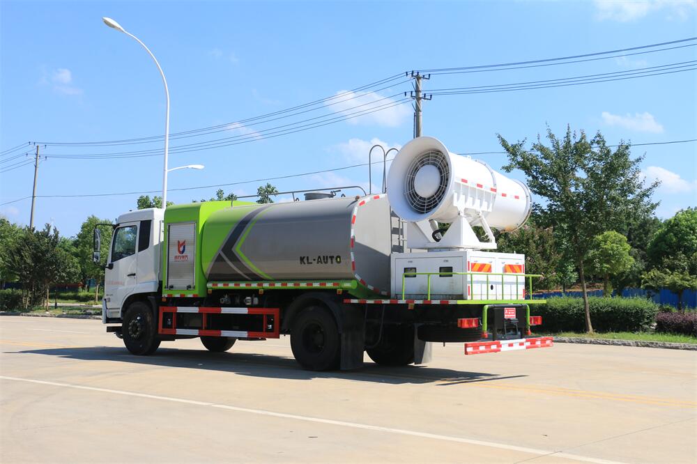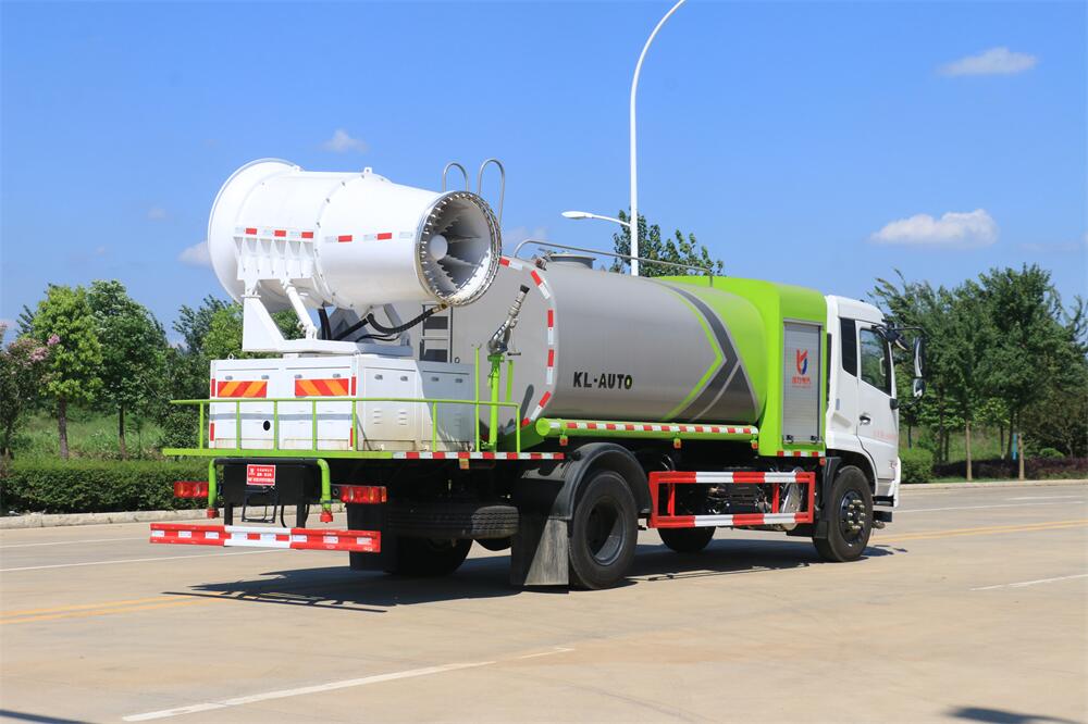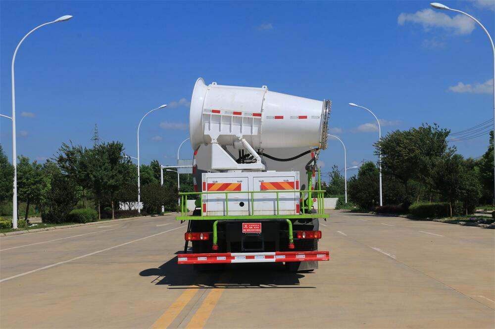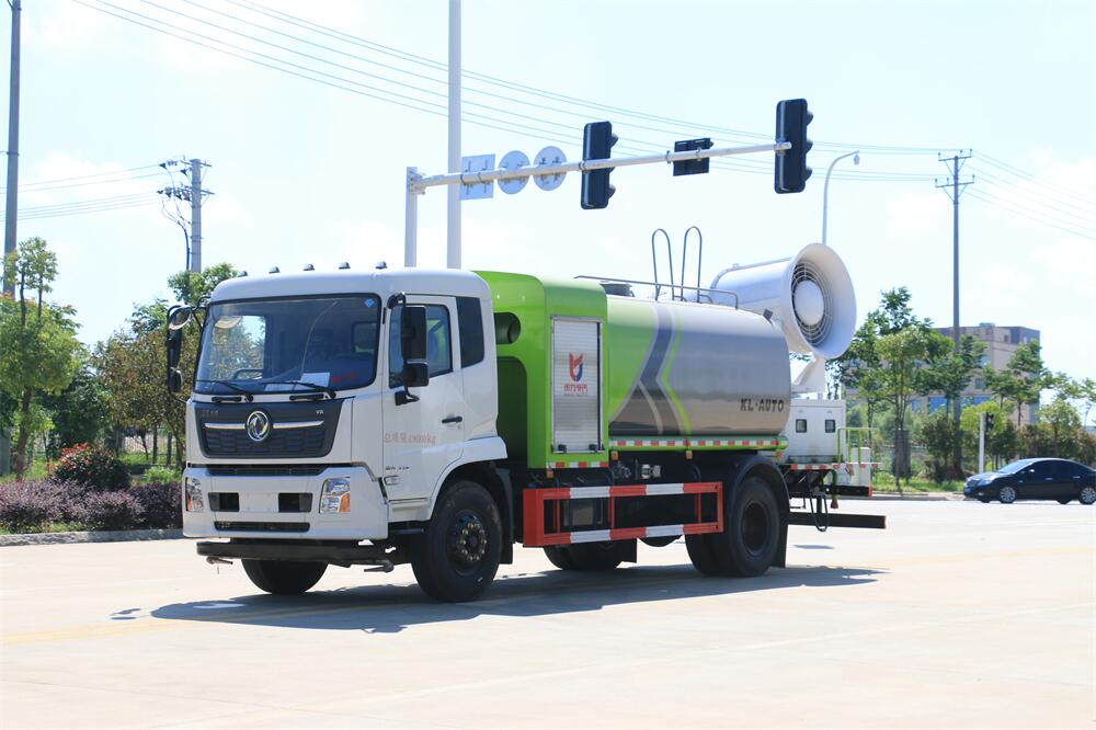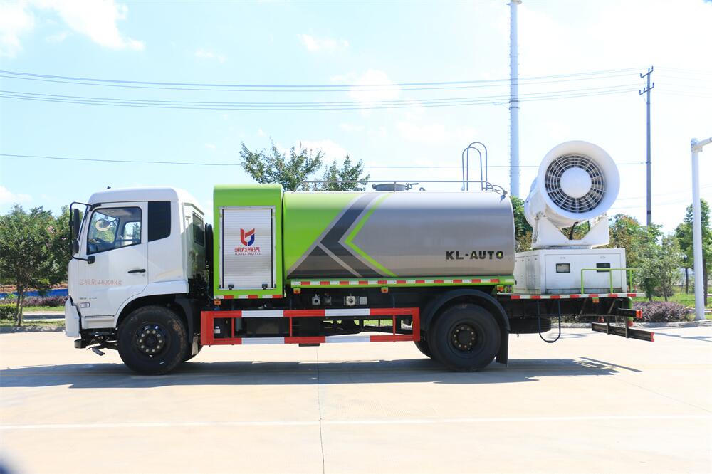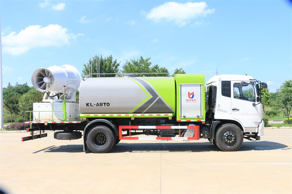 上裝配置:罐體容積為 12立方,選配風送式霧炮機組射程30米、40米、50米、60米、80米、100米、120米霧炮,罐體鋼板為4mm碳鋼Q235材質(zhì),罐內(nèi)隔板具有防波作用,以減輕汽車行駛時罐體液體沖擊,罐體及整車外形尺寸按照公告。帶大功率專用灑水泵,泵可自吸自排,整車前沖、后灑、側(cè)噴、帶65消防接口,后平臺配CLW-50、CLW-60、CLW-80、CLW-100、CLW-120型風送式霧炮機組;罐體前封頭配大功率柴油發(fā)電機組;前封頭帶水位計,后平臺主管路帶1寸澆花接口,后爬梯。帶兩根輸水管及陰陽端。罐體顏色:銀/灰/綠,罐體兩側(cè)噴“多功能抑塵車”字樣,貼反光標示。