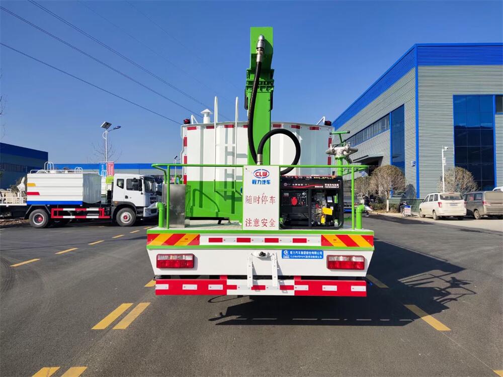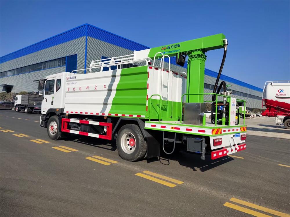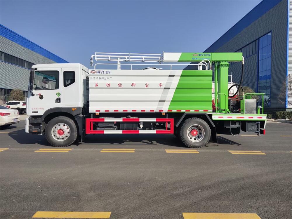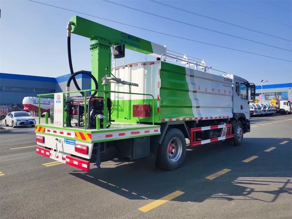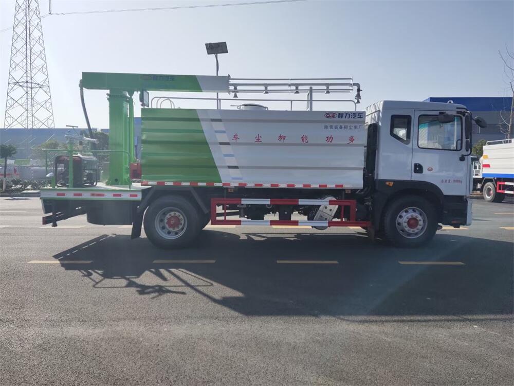 東風D9多功能鐵路抑塵車,整車型號:CL5186TDY6YC,底盤型號:EQ1185LJ9CDE,總質(zhì)量:18000KG,整備質(zhì)量(車輛自重):9660 KG,額定載質(zhì)量:(上戶噸位):8145KG,4500軸距,大容積罐體滿載15立方(罐內(nèi)采用環(huán)氧玻璃鱗片防腐處理質(zhì)保兩年)、新穎的罐體設(shè)計使車輛行駛更穩(wěn)定、使用壽命更長,大容量方型水箱,前沖、后灑、側(cè)噴、高炮,抑塵噴灑桿(帶旋轉(zhuǎn)升降功能,液壓升降、液壓旋轉(zhuǎn))。噴灑桿離地3.5-5.6米 、180°旋轉(zhuǎn),后部平臺帶8KW柴油發(fā)電機組、電控箱。整車采用全智能駕駛室觸摸屏及遙控操作:車輛噴淋系統(tǒng)、攪拌、旋轉(zhuǎn)臂、加熱等等功能。灑水功能采用主機動力。旋轉(zhuǎn)、升降、攪拌采用發(fā)電機組動力,配電箱預(yù)留外接電源接頭套。噴淋系統(tǒng)加裝單車流量計(用于計量抑塵劑噴灑量。)